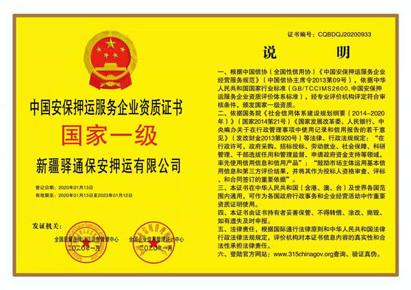 新疆驛通保安押運有限公司,注冊資本1000萬元人民幣,具有獨立法人資格,下設部門有:綜合管理辦公室、人力資源部、指揮中心、保衛部、財務部、業務部、押運部、督察隊、公司金庫。公司建立了符合市場和現代企業要求的經營運作模式和管理機制,有一套較科學的經營管理制度、守押勤務制度、守押作業規范化操作制度和標準。